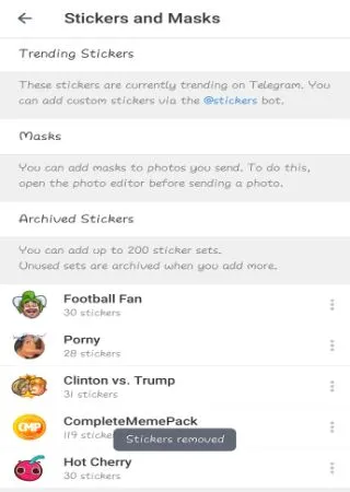 Telegram allows you to add up to 200 stickers after that used stickers will be archived. If you want to manually remove stickers from account follow below steps.