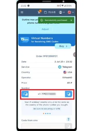 - Now, Use the virtual number to create an account on Telegram, you will get the OTP for registration on 5Sim website.